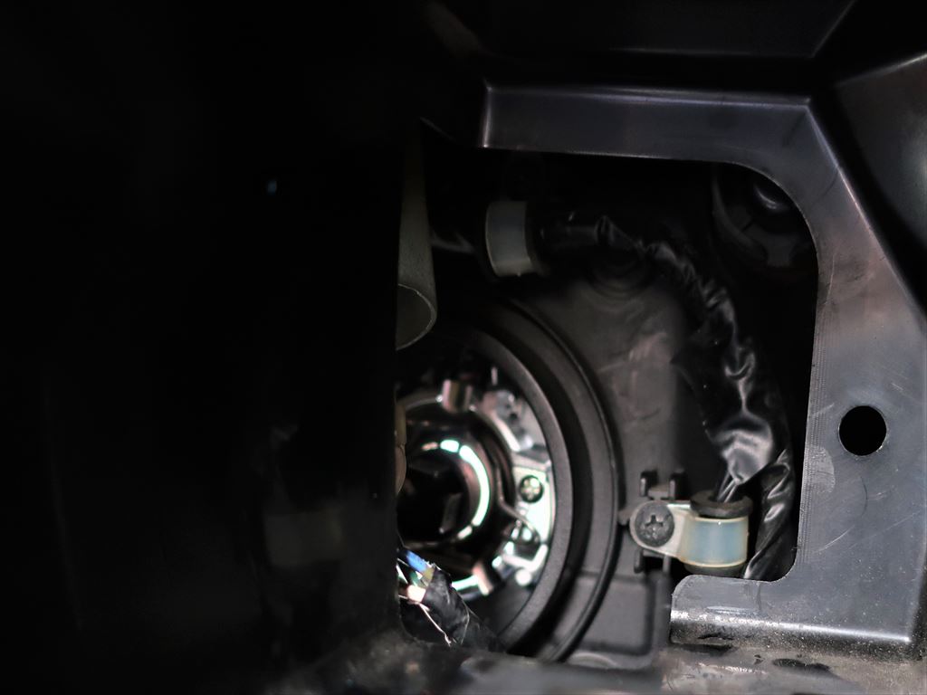 右側の時は、ネジを緩めすぎてポロっと外して無くしてしまったので、今回は一応下に落下防止の為に何かしようと思い、カバーの下から手を入れるとそのまま触る事が出来たので最悪ネジが落下しちゃっても100%地面に落ちるので安心してネジを少しだけ緩めて、バネのようになってるフックを外してライトバルブを取り出す