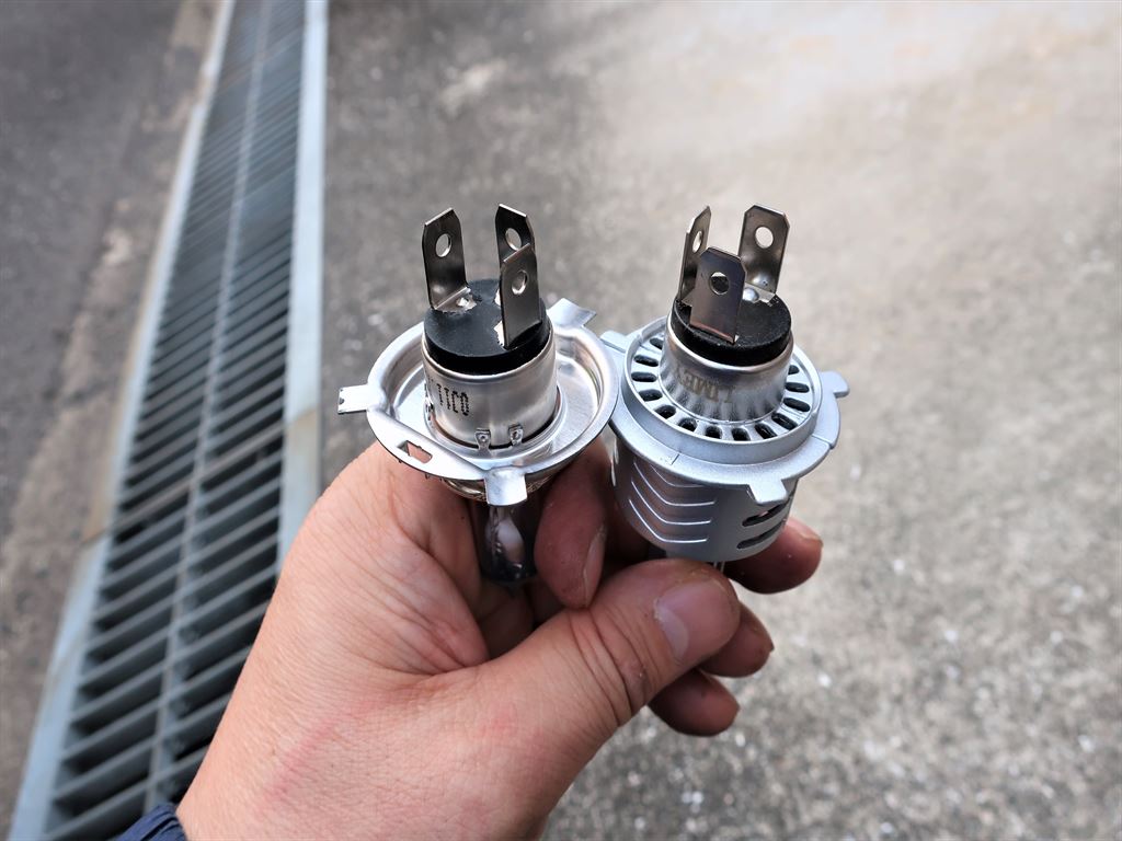 新旧のライトバルブ、ハロゲンライトに比べるとLEDなので形状がだいぶ違います