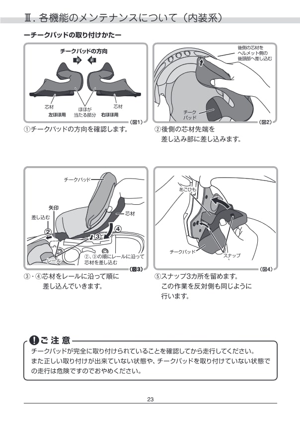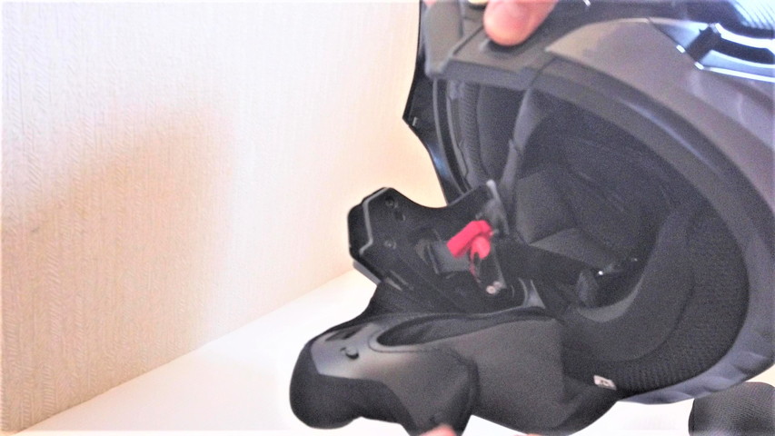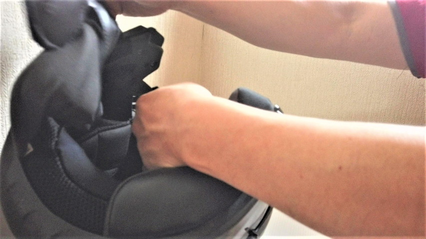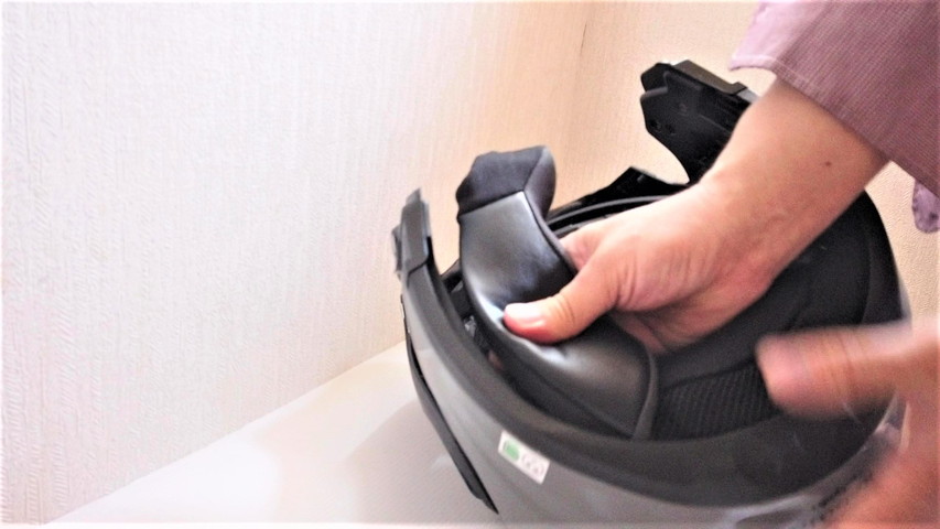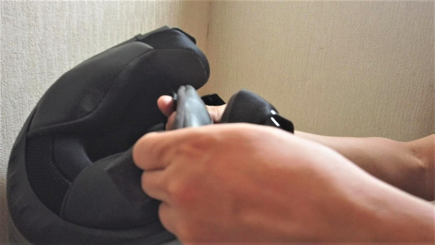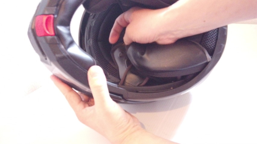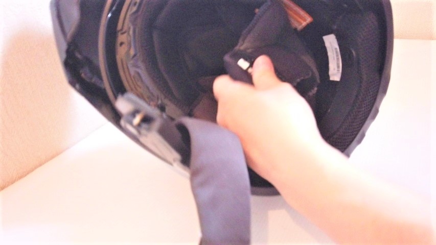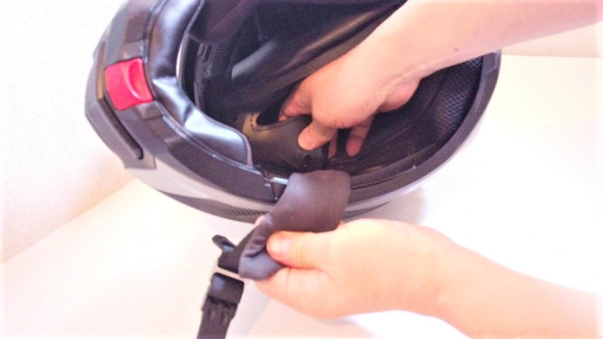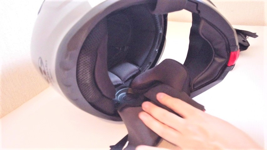 順番としては、私の場合はあごひもカバーが後になりましたが、同時に行うなら先にあごひもカバーをつけて、チークパッドですね