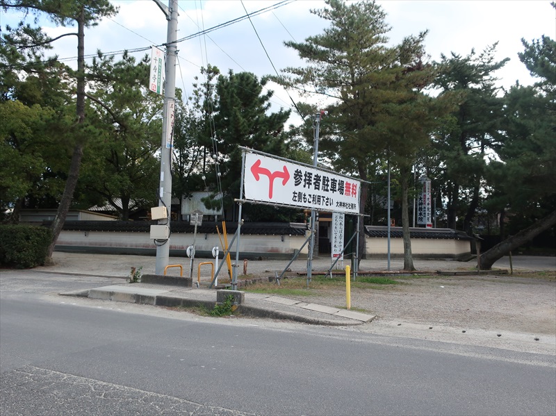 巨大な鳥居をくぐると無料駐車場が道の左右にあります