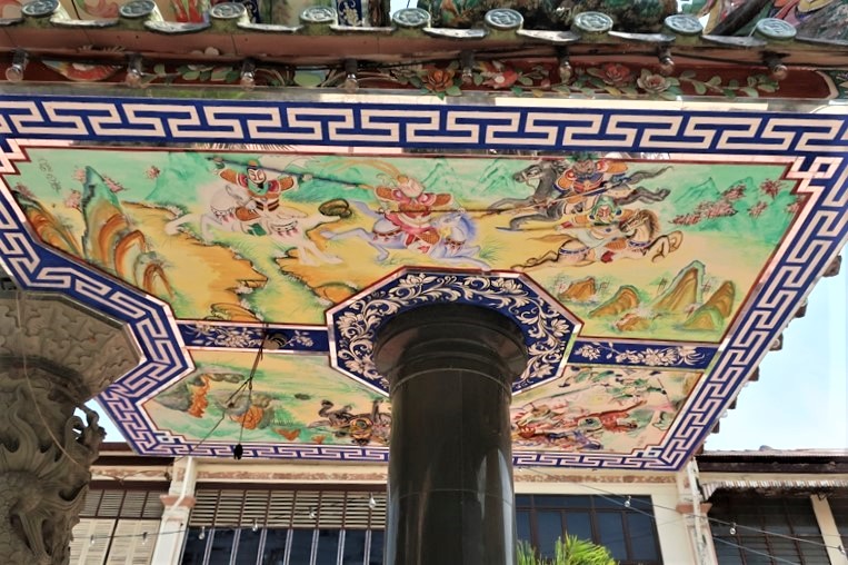 天后宮 儒教のお寺で装飾がきれい、日本と同じで靴を脱いで中に入ります門の天井の裏側にも綺麗な絵が描かれている(無料)