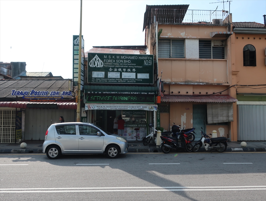 交差点にある店は100リンギット3.7円なので約27円、数件回って一番安かったM.S.K.M MOHAMED HANIFFA FOREX SDN BHD No59 (どこまでが店の名前なのかは不明)3.87で約26円で両替
