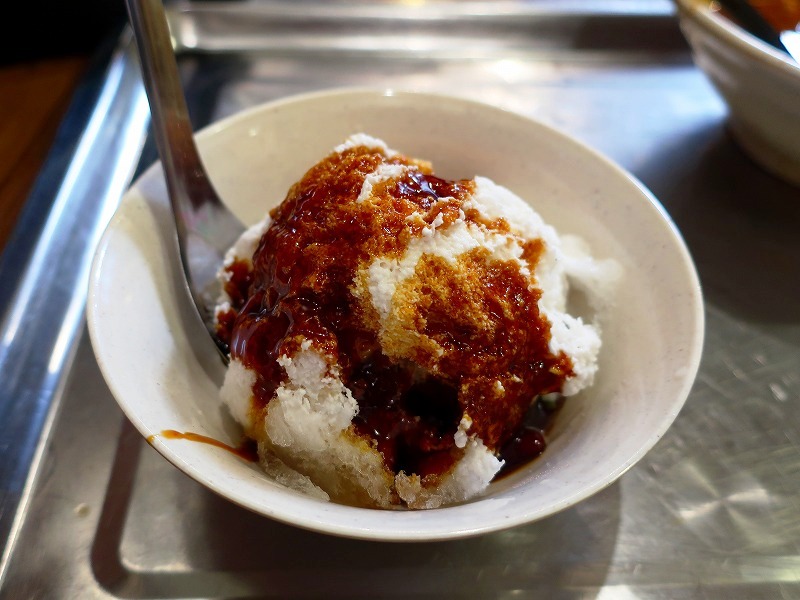 かき氷に黒蜜がかかっていて一見するとただの黒蜜かき氷