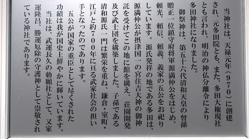 多田神社の歴史が書かれていますね、こういう文章って少し自画自賛な文章があったりしますが、実際に日本の歴史を変えて文化も変えたのは事実で、上記の五公が出てこなかったら今の日本が違う形になっていたのは間違いないでしょうね