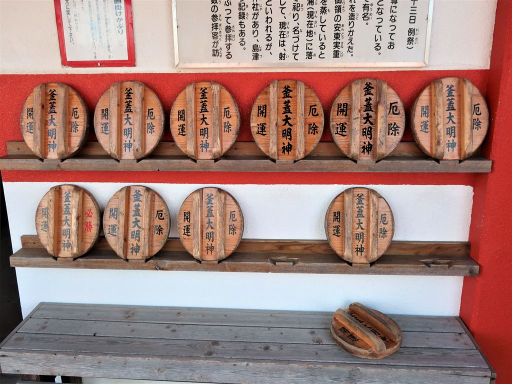 頭に釜蓋を乗せて鳥居から賽銭箱まで歩く事ができればご利益があるとされています