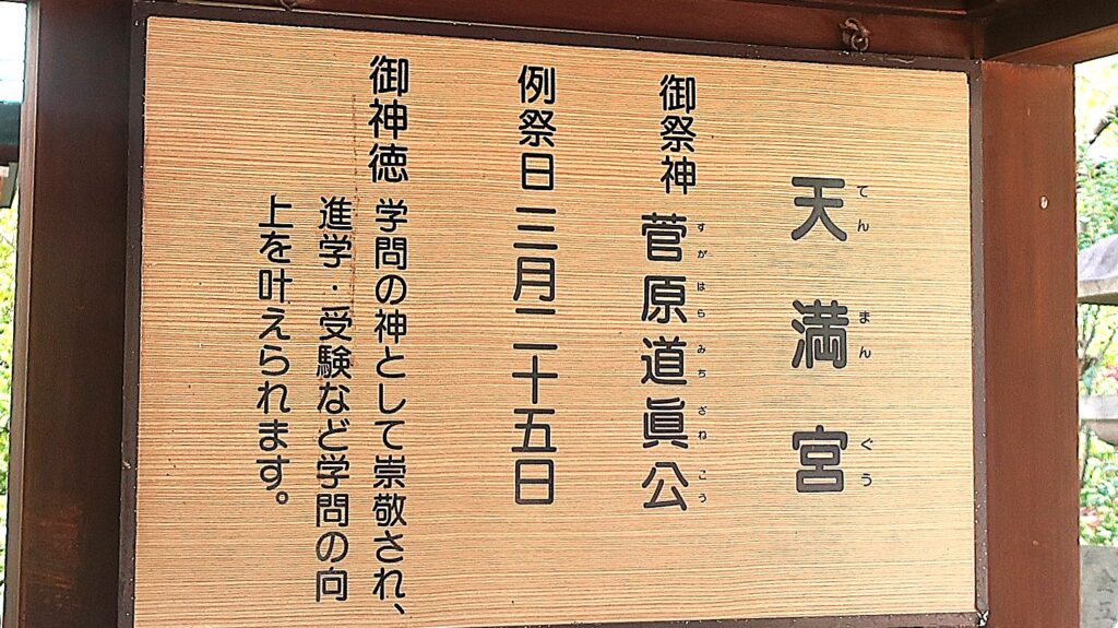 御祭神 菅原道真公 学問の神として崇拝され、進学・受験など学問の向上を叶えられます