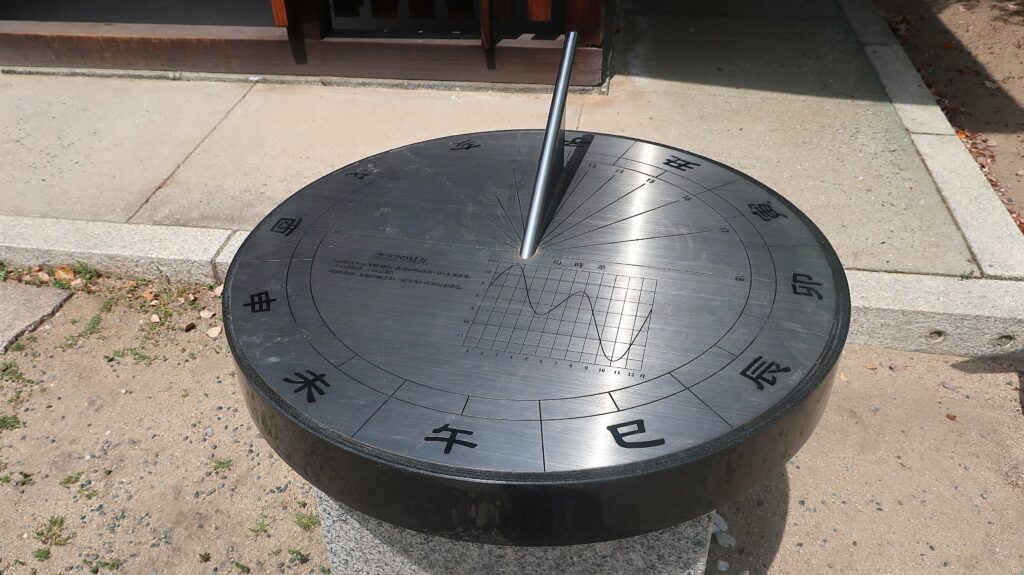 日時計が置かれてました、12時10分ごろで子の刻の少し先を指してて合ってますね