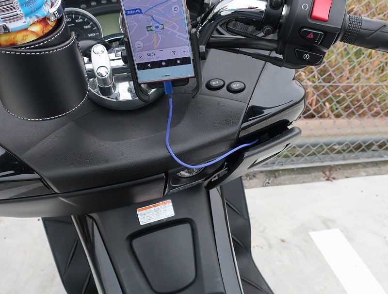 バイク専用駐輪場に停める、思った以上にスマホ本体に電池が減ってるので、ボックスに充電器を入れてケーブルで充電、こんな時にビッグスクーターは便利