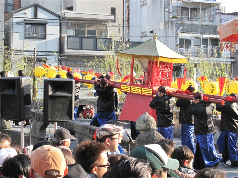 ランタン祭のイベントと一つで媽祖(まそ )さまが眼鏡橋の上を通ります