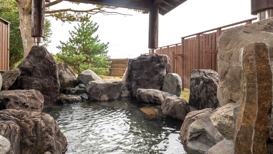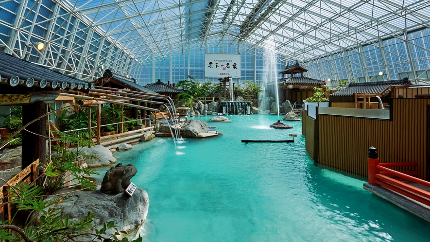 想像を超えるスケール感。奥行25mの庭園大浴場に豪快に湯が流れる様は圧巻で温泉はすべて源泉かけ流しと圧倒的湯量を誇る温泉天国です。